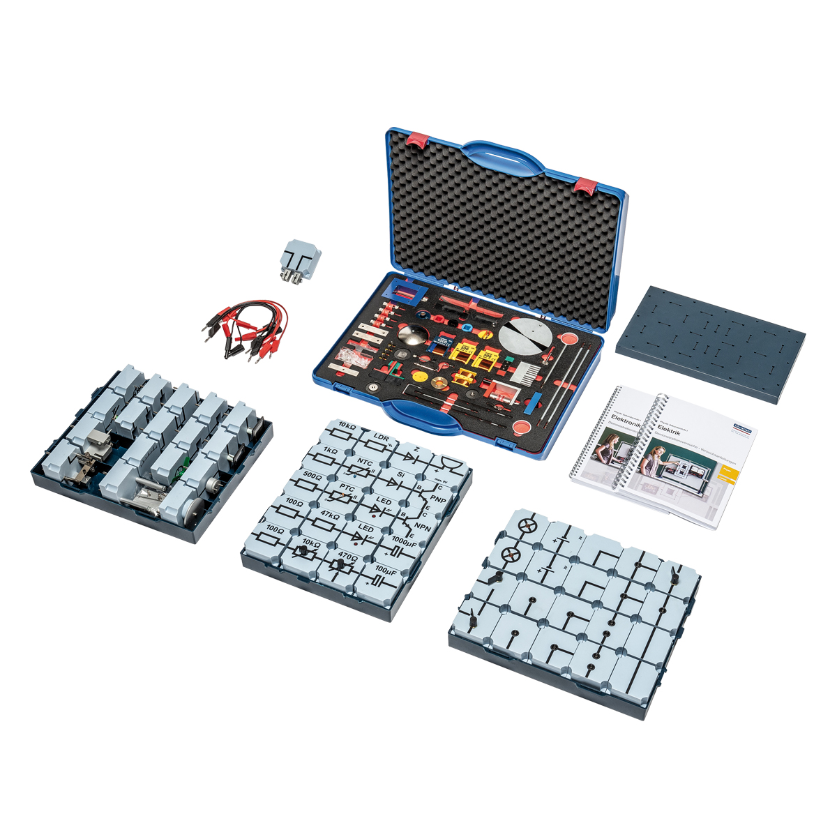 Large robust plug-in modules for experiments in the fields of electrics, electronics and electromagnetism. Various circuits can be assembled using the plug-in plate. The whole system can be used by pupils as a clear system as well as by teachers on a magnetic board.
