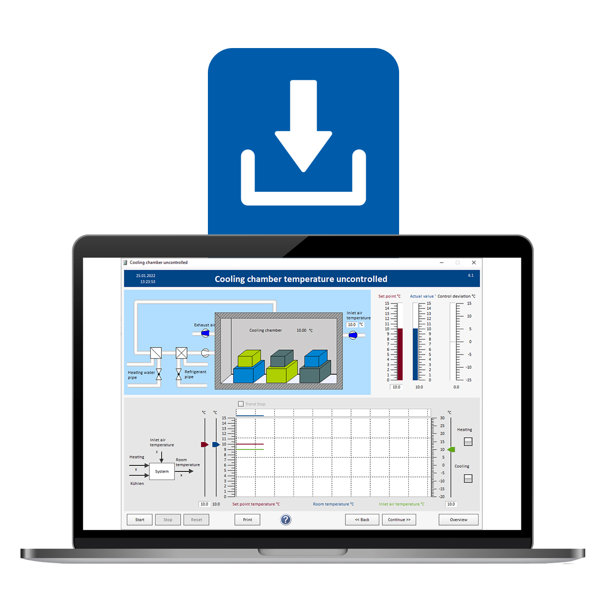 Learn the basics of control engineering interactively using simulated processes. The time behaviour of the control loops is examined for different control loops. Unstable control loop behaviour, permanent control deviation and the optimisation of control loops can be demonstrated through the free selection of controllers and controller parameters. The storage of all signal curves enables a subsequent graphical evaluation of the time behaviour of the controls. A comprehensive manual including tasks and solutions supports individualised and action-oriented learning. The manual is provided in digital form.