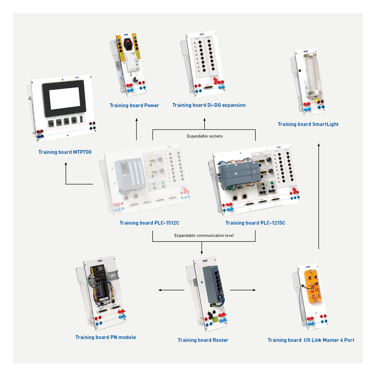 The training board set consists of the training boards shown in the picture. The Siemens Simatic S7-1215C is used as the central controller for this set. The set is supplemented by the D-SUB cables that match the controllers used. With this set, you and your trainees are are optimally prepared to program our mMS functional assembliesor our industrial models.