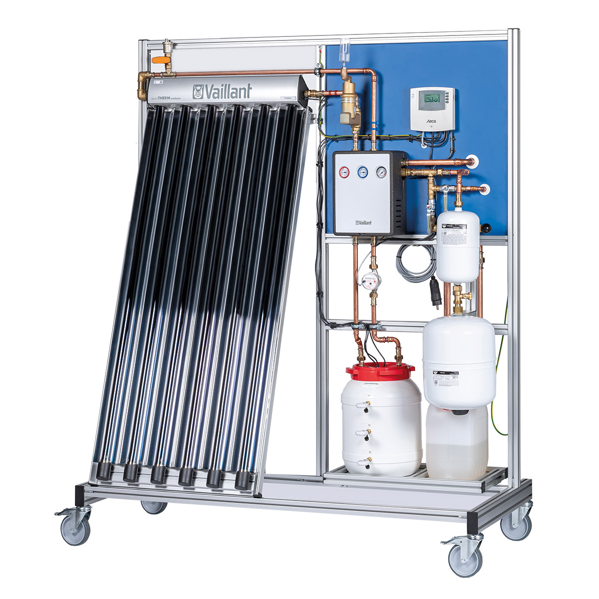 Mobile solar thermal training stand, with tube collector, on frame made of grooved extruded aluminium profile on castors (diameter 125 mm)