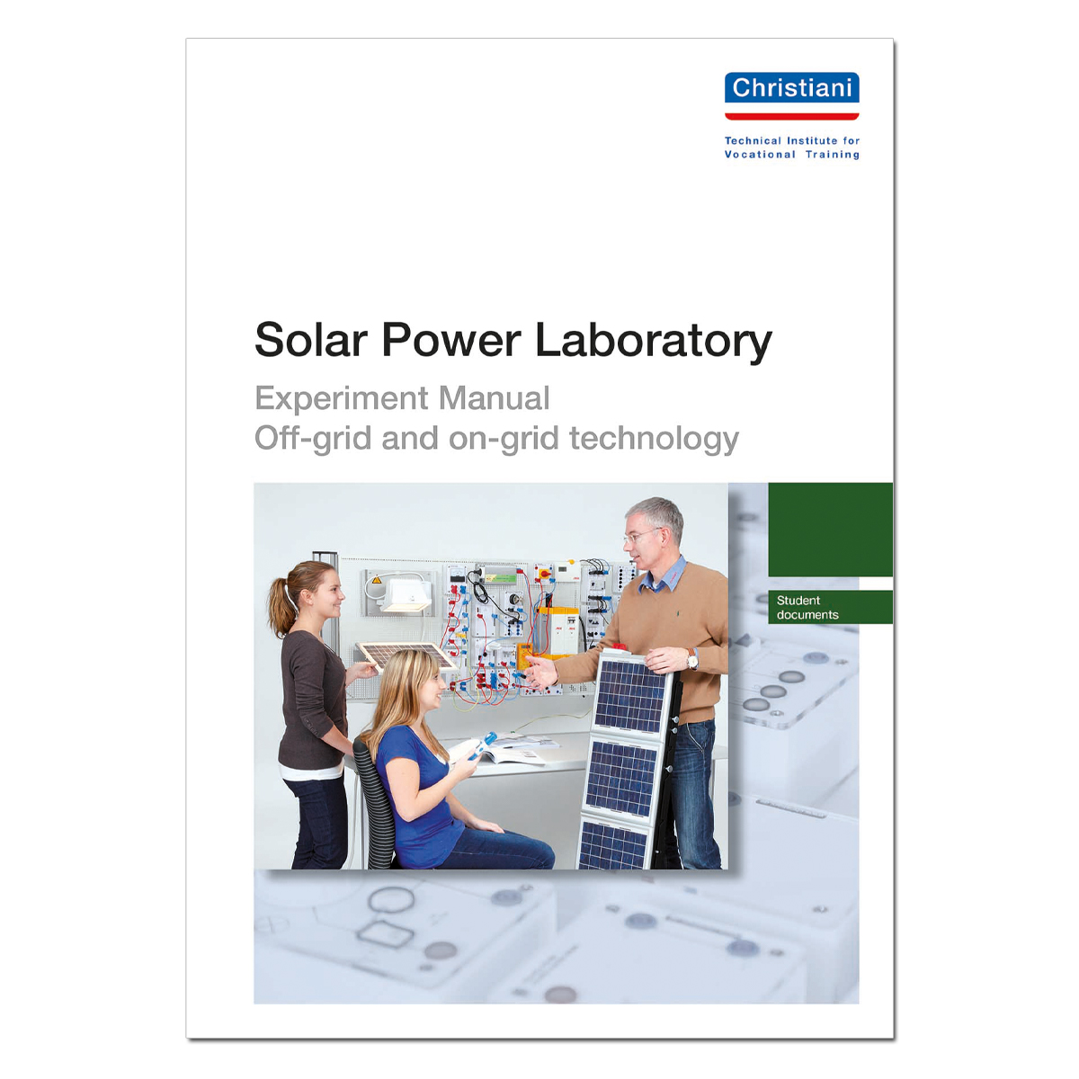 The experiment manuals for the solar power laboratory are the result of various further-education concepts. Besides basic information on climate protection and renewable energy given in separate sections, the manuals provide an introduction to off-grid and on-grid technologies. The teacher documents are in colour. These documents include the solutions for the exercises and are available in German and English. The students' copy is printed in black and white and does not include the section with solutions.