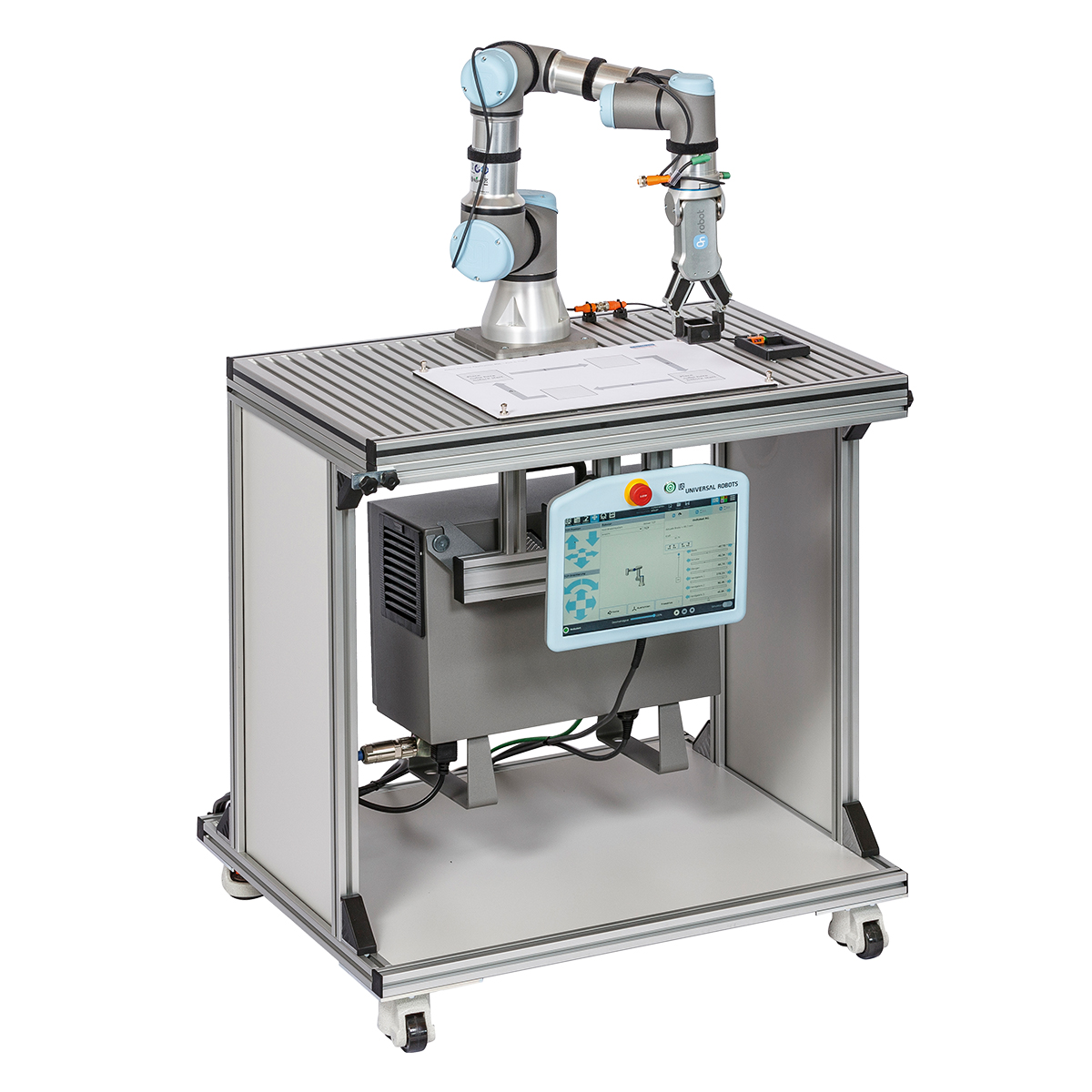 The UR3e robotics station is securely mounted on a grooved plate with profile carriage. The powerful controller is located below the grooved plate. The UR3e station is additionally equipped with a sensor-supported workpiece holder. Individual application templates can be attached to a support surface with magnetic fixings. They support the learning of the basics of robot programming.