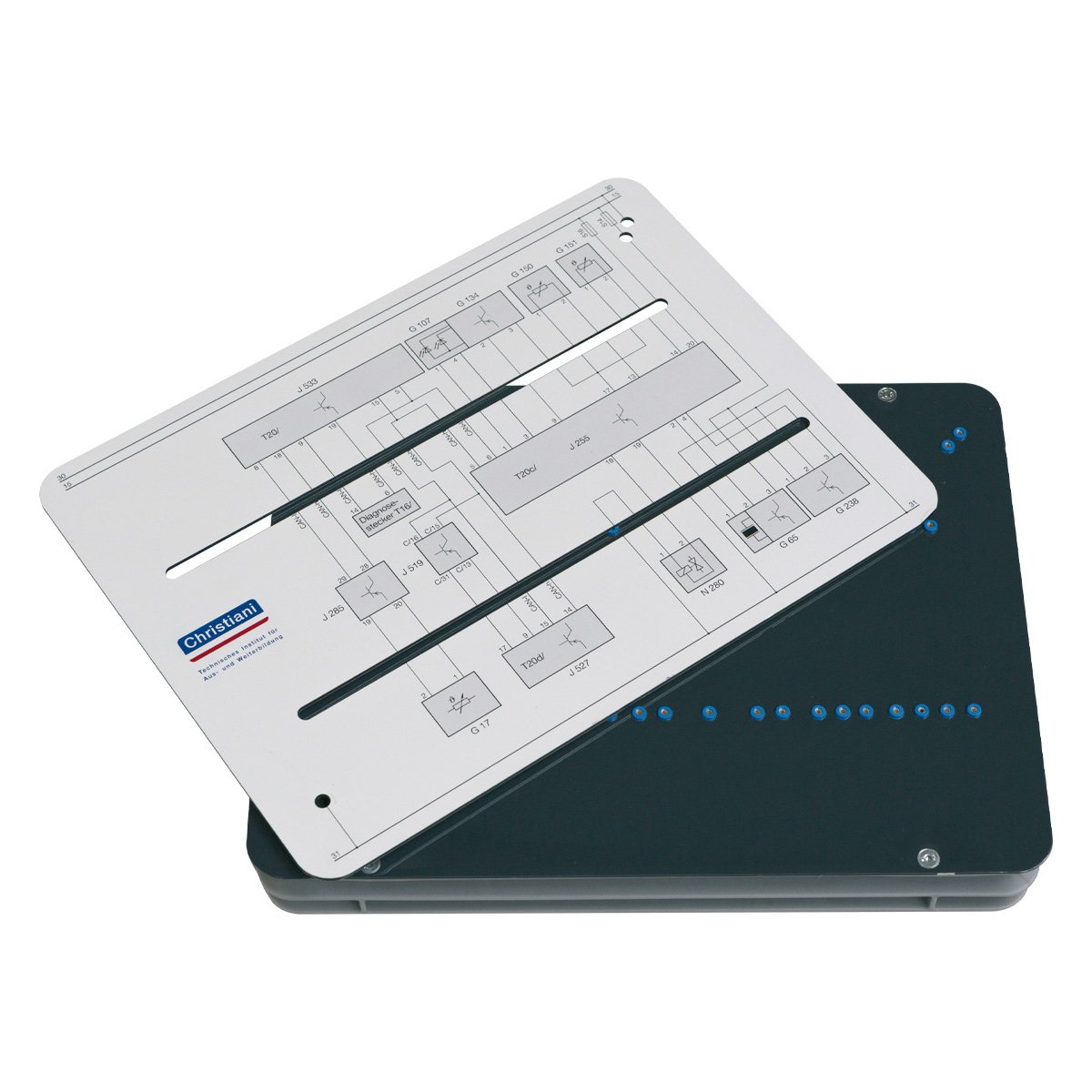The training test bench for Christiani training systems is a universally applicable, robust plastic case with a carrying handle. The case is equipped with 45 safety measuring sockets, each with a 2 mm diameter. The test bench can be used with all Christiani training systems that feature a training test bench interface. Each test bench includes a connector for expanding up to a total of 12 test bench units. Each test bench comes with a 1-meter connection cable for connecting to the training system or for expanding with additional test benches. The appropriate circuit diagram overlay for the respective training system must be ordered separately.