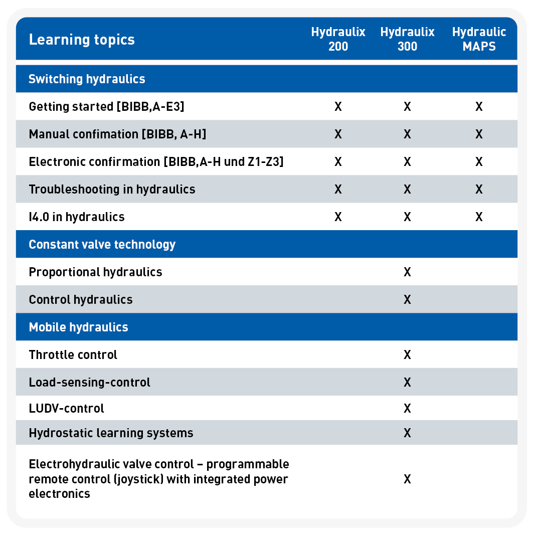 The Hydraulix 200 benefits from its low entry price and practical compactness. Learning topics such as proportional valve technology and mobile hydraulics are taught on our proven Hydraulix 300 workstation. The multifunctional ‘MAPS’ workstation system can also be expanded to include hydraulics technology. The learning topics of switch hydraulics, pneumatics and automation technology can be covered on our flexible MAPS workstation system. The following table provides an overview of the possible learning topics: