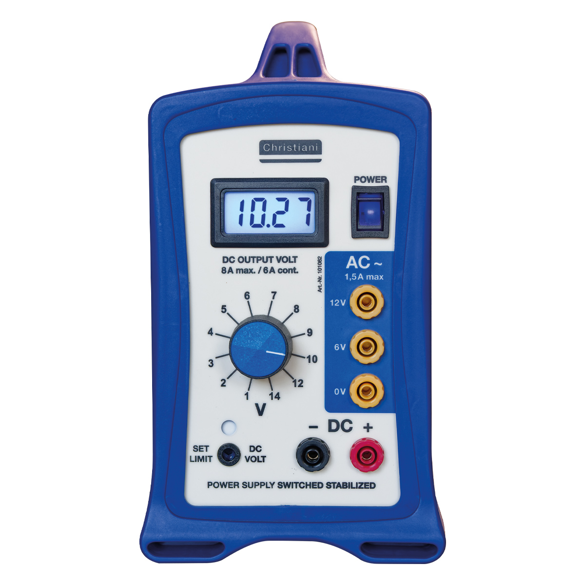 La fuente de alimentación para estudiantes AC / DC (estabilizada) 1-14 V DC en 12 pasos - 6 / 12 V AC es una fuente de alimentación práctica y fácil de usar para usar en clase. Se puede utilizar para generar un voltaje CC estabilizado. Los voltajes de salida se pueden configurar entre 1 V y 10 V en pasos de 1 V y entre 10 y 14 V en pasos de 2 V. Suministra una corriente continua de 6 A en todas las tensiones de salida CC, que también puede aumentar hasta 8 A durante períodos cortos (menos de 1 h). Por encima de 8 A, la tensión de salida se regula hacia abajo (limitación de corriente). Además, el alimentador dispone de una salida AC de 6 V y 12 V con un máximo de 1,5 A. Esta salida se puede utilizar simultáneamente con la salida DC. Esta salida se puede utilizar simultáneamente con la salida CC. El voltaje de salida se muestra digitalmente en una pantalla iluminada. La fuente de alimentación es fácil de transportar gracias a su práctica asa. En la fuente de alimentación para estudiantes se utiliza una fuente de alimentación conmutada con un transformador de seguridad para generar la tensión continua. Esto asegura el aislamiento galvánico. El diseño evita que los alumnos entren en contacto con componentes activos a través de las aberturas de ventilación, incluso con objetos puntiagudos. Los enchufes están diseñados como enchufes de seguridad. Se pueden utilizar cables de experimento con clavija de seguridad de 4 mm, así como con clavija tipo banana de 4 mm. La tensión máxima de salida se puede limitar con una llave Allen de 3 mm (incluida en el suministro). También se pueden configurar voltajes entre dos niveles. De este modo se pueden evitar daños en el equipo experimental debido a una tensión de salida inadmisiblemente alta.