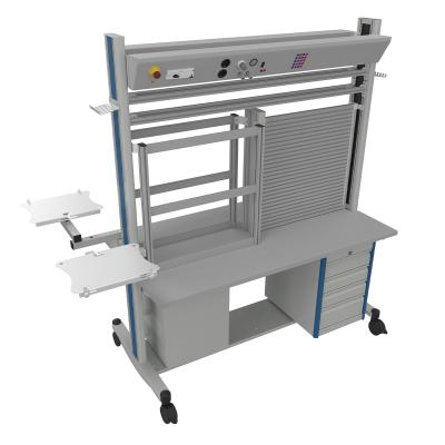 MAPS Professional consta de los siguientes componentes: 1. Estructura básica móvil (1x) - La estructura estable está hecha de un robusto perfil de aluminio extruido. El perfil tiene dos ranuras a cada lado y dos canales de cables separados. - Dimensiones (AnxPrxAl): 1.600 x 800 x 1.970 mm - Todo el puesto de trabajo es móvil - Componentes: - 1x juego de fijación para tablero - 2x soportes para tablero de acero - 1x mueble bajo móvil con pies de 124 mm de alto - 4 ruedas giratorias 100 mm, los 4 con cerradura - 2x columnas Quadro de perfil de aluminio extruido de 1.838 mm de altura con perfil decorativo como cubierta para canales de cables - 2x decoraciones encajables en el exterior - 2x decoraciones encajables en el interior, con listón de cepillo para canales de cables - 1x columnas de perfil de aluminio extruido de 760 mm de altura, montadas centralmente en el tablero - Color/decoración: - Partes centrales: gris claro (RAL 7035) - Piezas decorativas: gris claro (RAL 7035) / azul tráfico (RAL 5017) 2. Tablero (1x) - Dimensiones (AnxPrxP): 1.600 x 800 x 27 mm - Altura de trabajo: 800 mm - Fabricado en laminado duro resistente, gris claro 3. Placa ranurada (1x) - Dimensiones (AnxPrxAl): 730 x 815 x 30 mm - Fabricada con placas de perfil de aluminio - Distancia entre ranuras: 25 mm - Dimensión de ranura: 8,9 mm - Para alojar componentes con sistemas de fijación rápida - Montado entre columnas inclinables 4. Juego de perfiles horizontales (1x) - Dimensiones (AnxPrxAl): 1.505 x 30 x 30 mm - Fabricado en perfil de aluminio - Dimensión de ranura: 8,9 mm - Para alojar cajas eléctricas y componentes con sistemas de fijación rápida - Montado entre las columnas ** 5. Marco experimental (1x)** - Dimensiones (AnxPrxAl): 730 x 117,5 x 709 mm - Montado entre las columnas - 2 filas - Para sostener tableros de entrenamiento DIN-A4 6. Portacables (1x) - Fabricado en chapa de acero RAL 7035, 141 mm de longitud - Para alojar enchufes de laboratorio de seguridad de 4 mm con 6 filas (tira ranurada de 10 mm) 7. Terminal de energía (2x) - Dimensiones (AnxPrxAl): 1.600 x 325 x 150 mm - Ancho útil 1.500 mm - Para alojar módulos de seguridad y placas insertables - Terminal de energía completamente preequipado y cableado - Montaje en cada lado (puesto de trabajo) desde De izquierda a derecha: - Unidad de seguridad y conmutación - Monofásico, incluido disyuntor 10-16 A - Disparador de mínima tensión - Parada de emergencia - RCD 25 A/30 mA, 2 polos tipo B - Lámpara de control - Conexión a la red - Cable de red de 3 m, toma WINSTA - Enchufe CEE de 5 polos 16 A - Módulo de toma - Monofásico, 2 tomas con conexión a tierra - Regulador de aire comprimido - Regulable de 0,5 a 12 bar con manómetro y acoplamientos rápidos de 1/8" - Fuente de tensión fija - 24 V / 6 A CC, 2 tomas de laboratorio de seguridad - Interruptor basculante ON/OFF - Placa distribuidora - 2 x 10 tomas de laboratorio de seguridad rojas y azules, conectadas a alimentación CC - Placas vacías 8. Soporte para portátil (1x) - Con brazo giratorio - Inclinación ajustable 9. Contenedor colgante (2x) - Con 4 cajones, cierre suave, totalmente extensible - 3 cajones de 2 HE (100 mm) - 1 cajón de 3 HE (150 mm) - Color: partes metálicas gris claro ( RAL 7035) / piezas decorativas azul tráfico (RAL 5017) 10. Conexión de aire comprimido (1x) - con manguera de aire comprimido de 3 m - incluido conector de acoplamiento